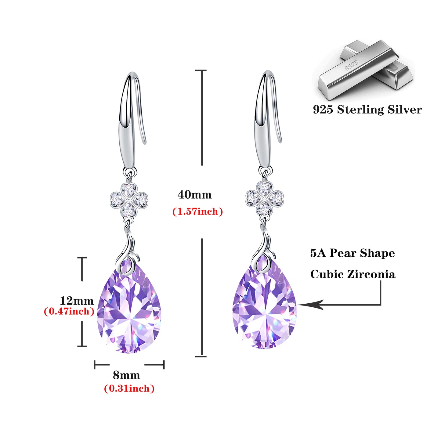 925 Silver 5A CZ Diamond Four Leaf Clover Dangle Earring (Lavender)