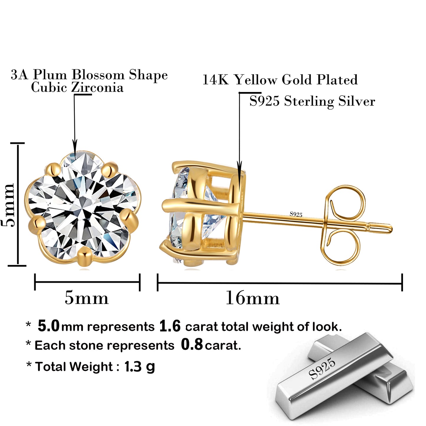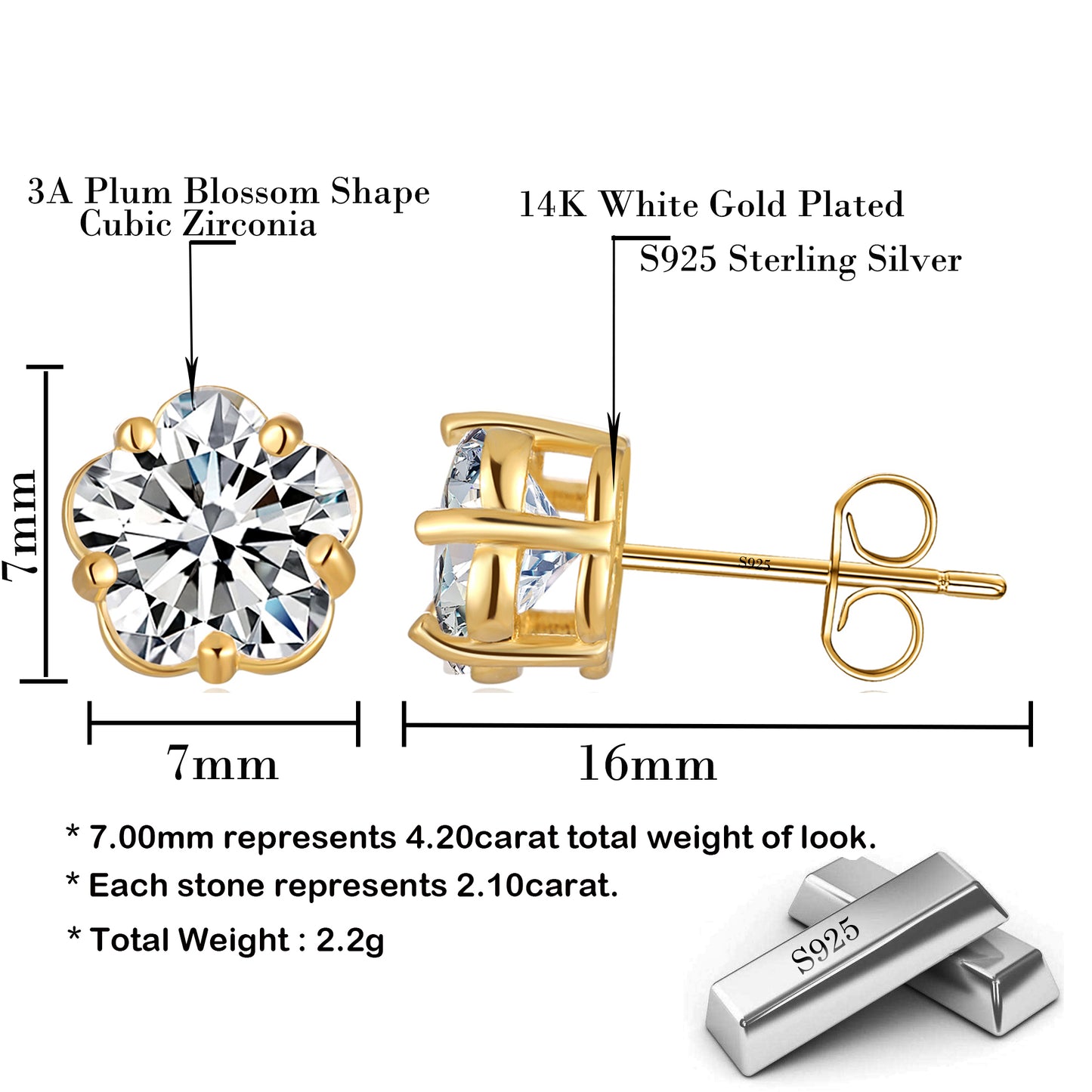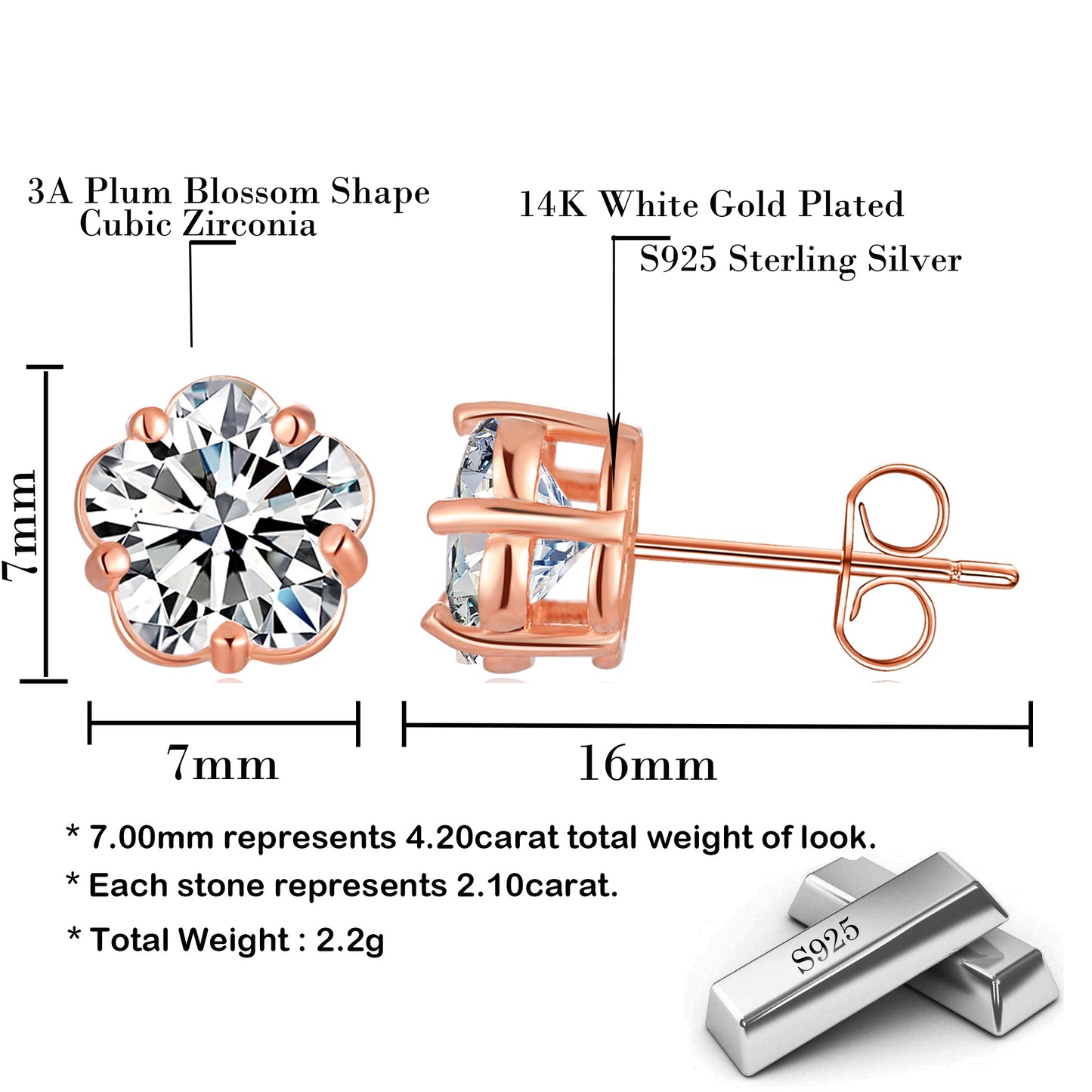 - Fashion women studs earrings made with gold plated 100% 925 sterling silver blossom plum design with yellow gold white gold and rose gold plated Made From Professional Quality Material,No allergic materials, and secures with butterfly cup clasp